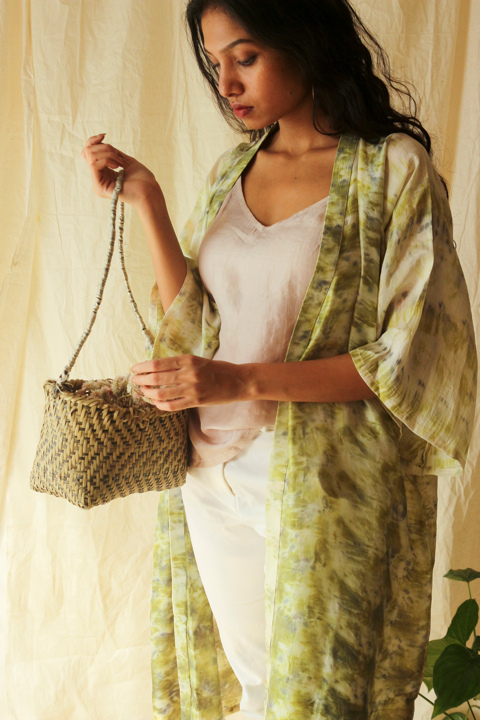 All our kimonos our free size making it extremely versatile whether you are lounging in your house or going for a night out. The lovely handwoven and slightly translucent silk feels really luxurious and soft on the skin and makes you feel extremely relaxed.