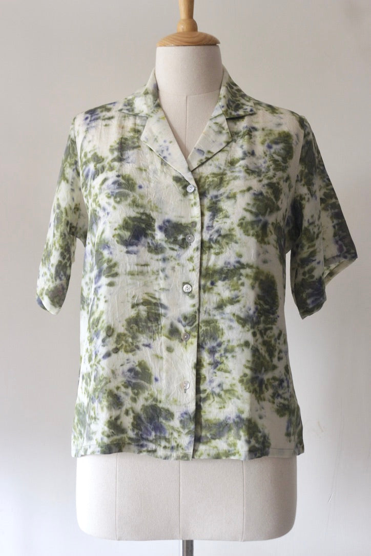 An effortless handwoven mulberry silk shirt dyed with hibiscus flowers. The silk is light, soft and breezy.