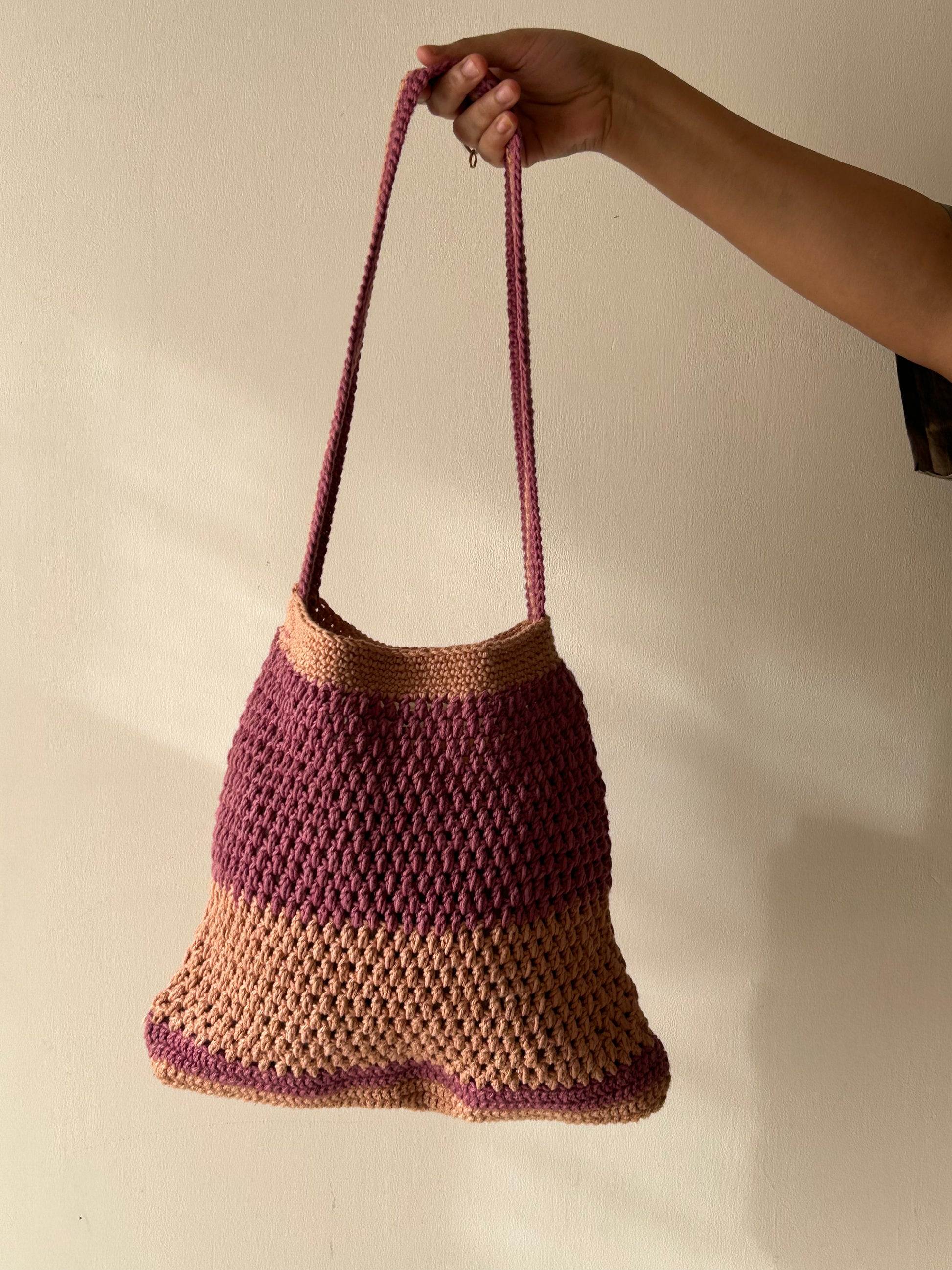 The bags are made using plant dyed cotton yarn in various colours. All the colours for each bag for also carefully picked by her.