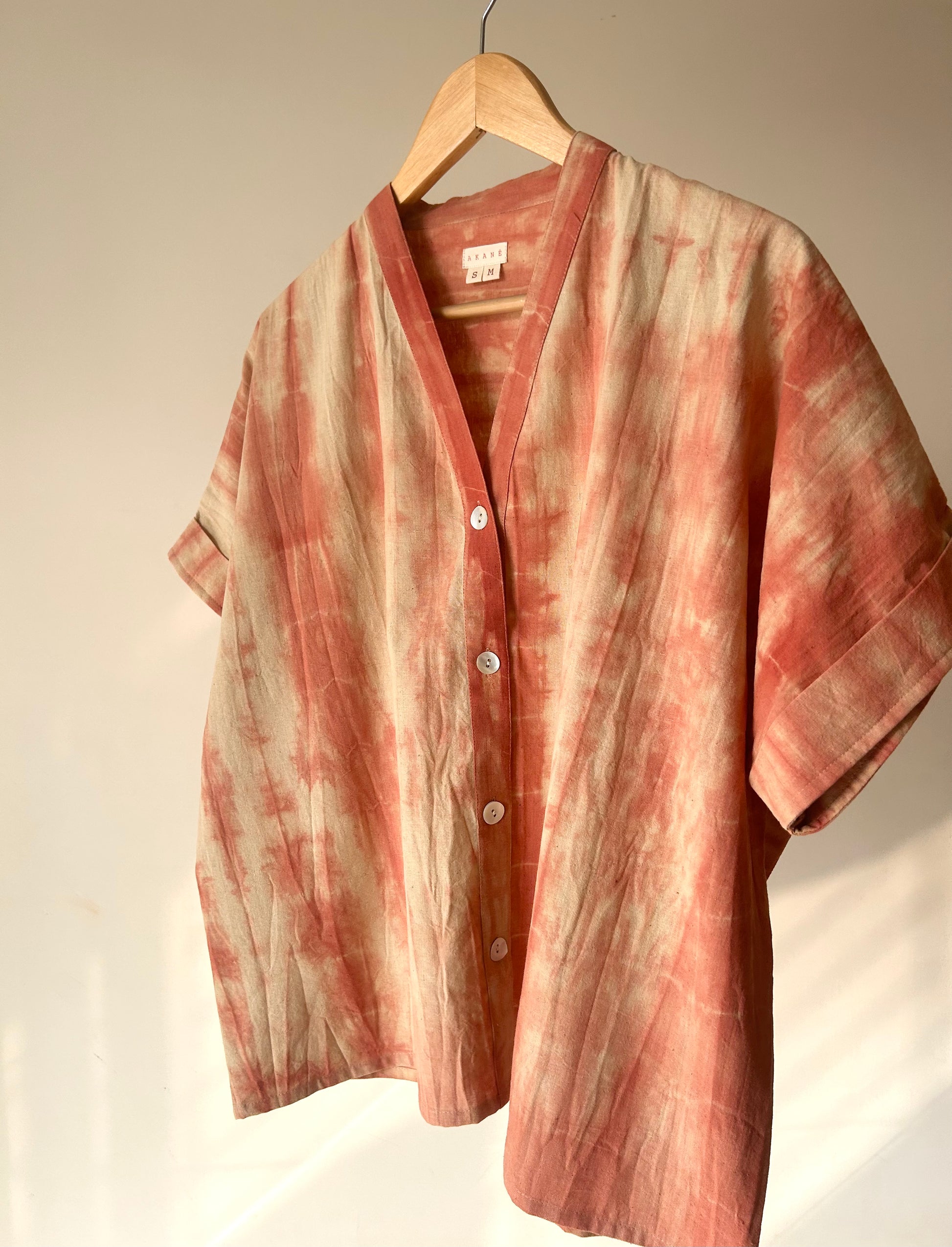 Made in handwoven cotton from West Bengal and hand dyed with Indian Madder Root in a shibori print, the kimono shirt is versatile effortlessly comfortable.