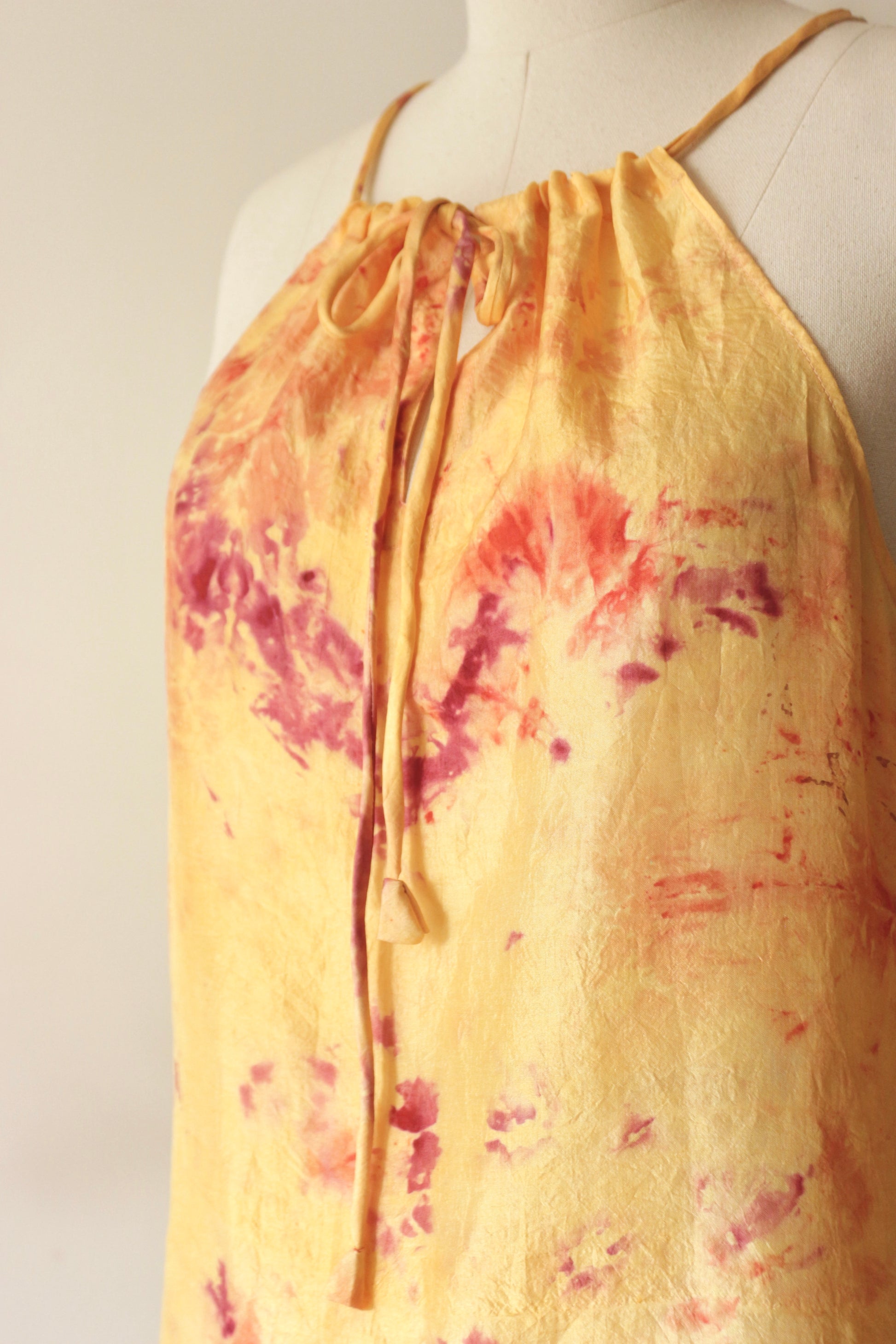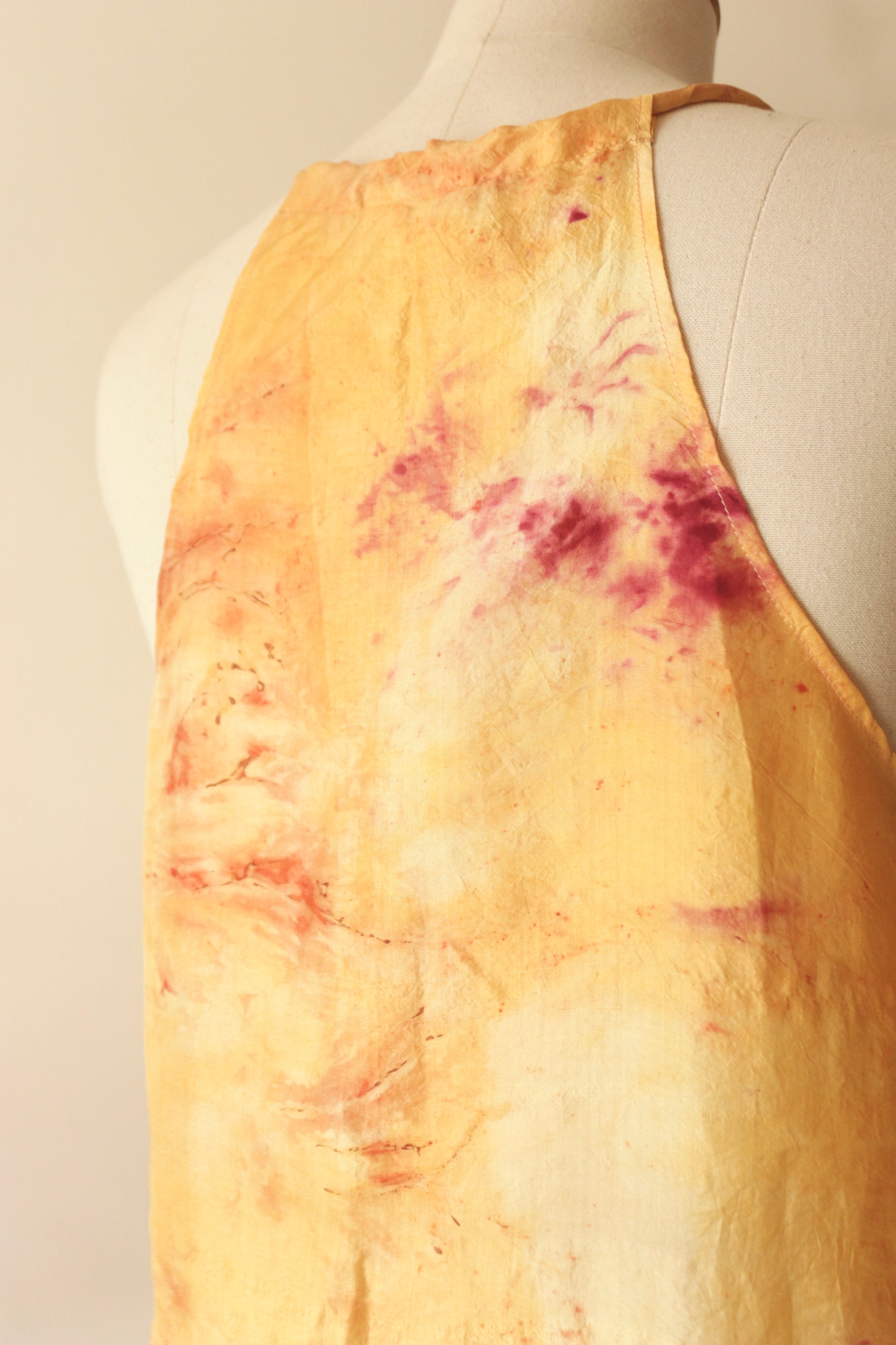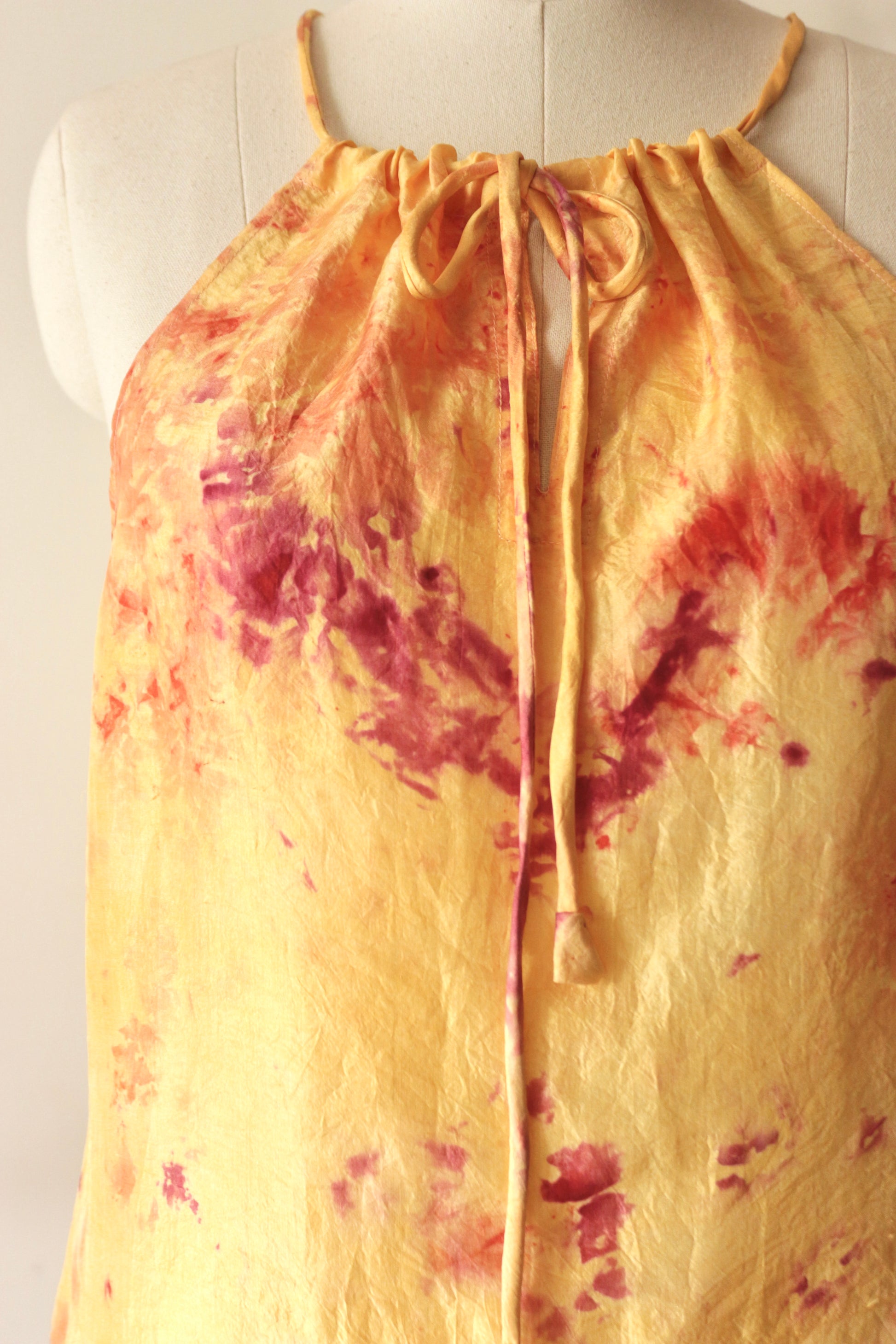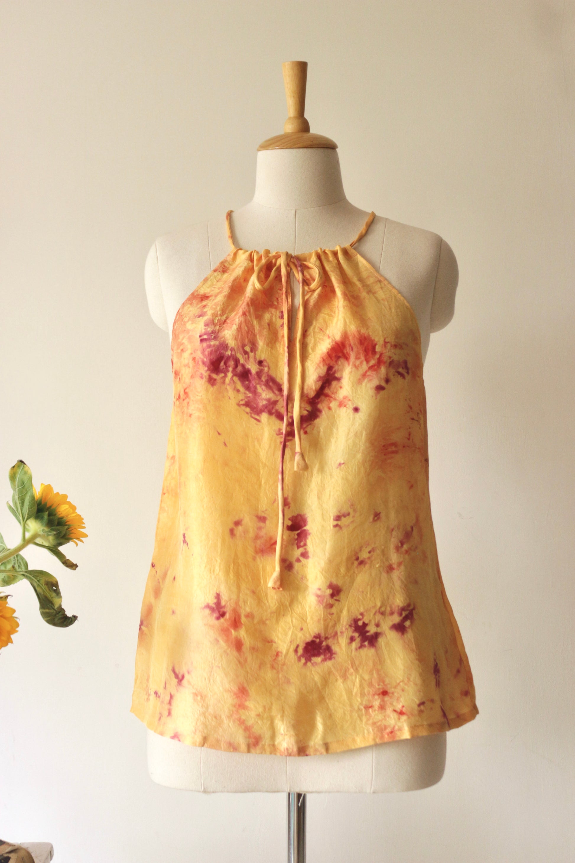A breezy handwoven mulberry silk top ice dyed with Tesu flowers, Lac & Madder Root. The silk is light, soft and feels great on the skin.