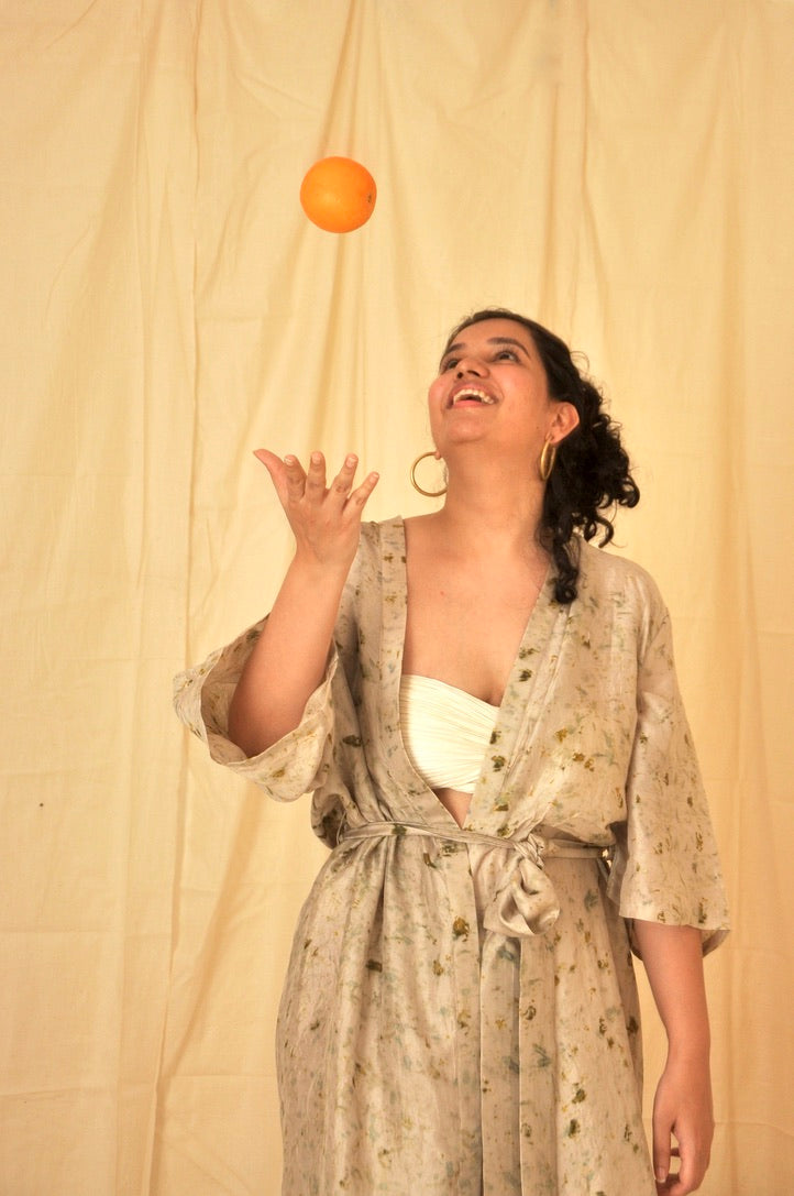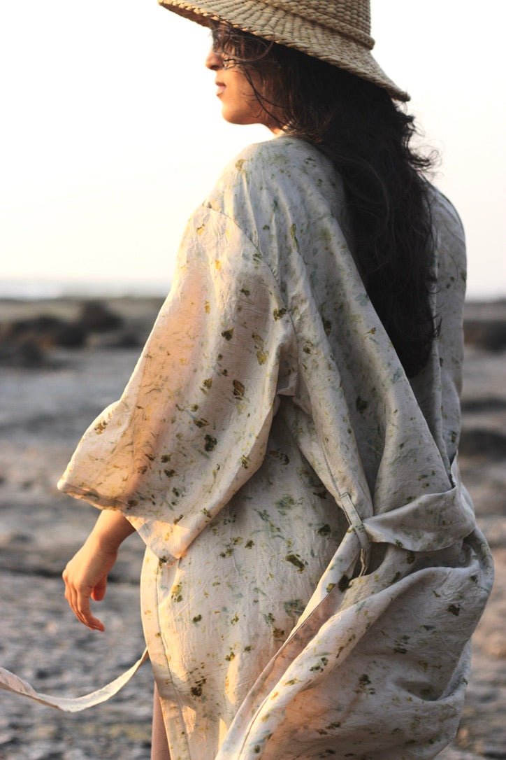 The Luna Mulberry Silk Kimono Robe has been hand dyed using Alkanet, Chrysanthemum, Aster and Marigold petals.