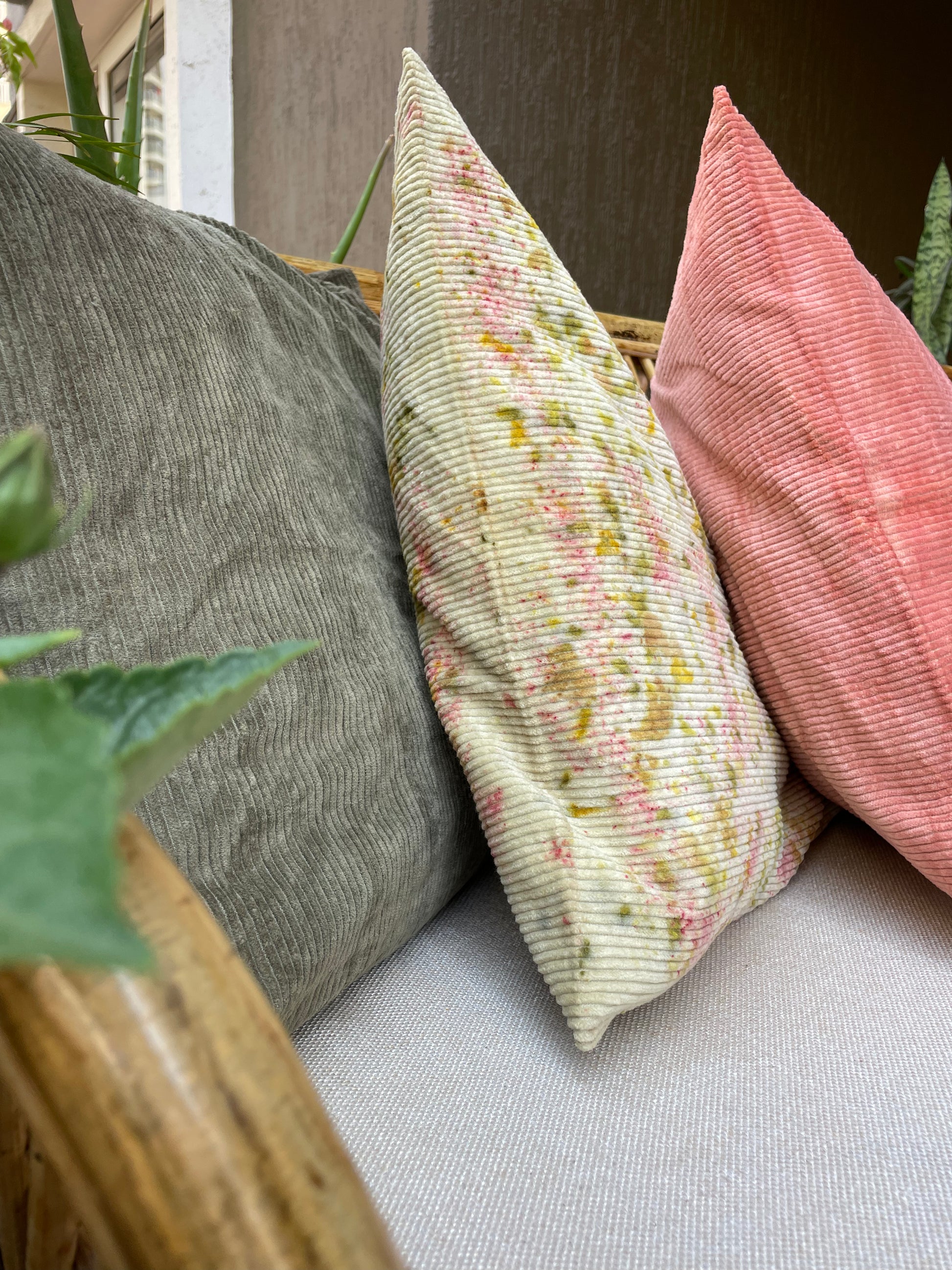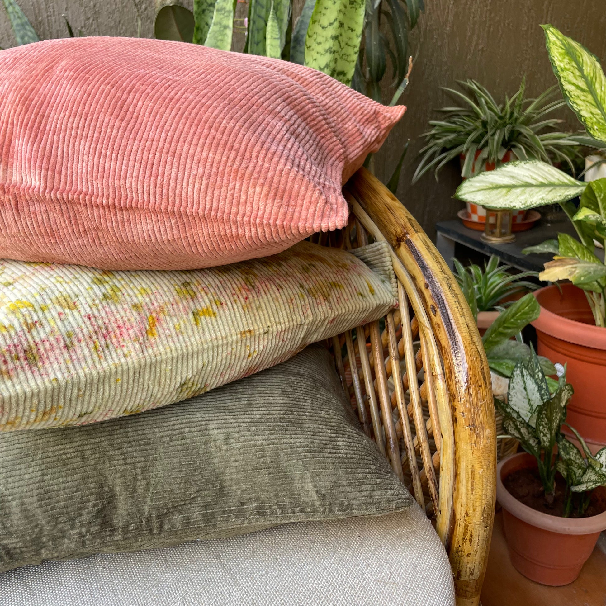 Made from 100% cotton corduroy, this cushion cover is naturally dyed using plant and flower extracts, giving it a soft, organic shade of pink. A collaboration between Green Tailor & Akané Studio, it celebrates the beauty of natural pigments and slow craftsmanship.