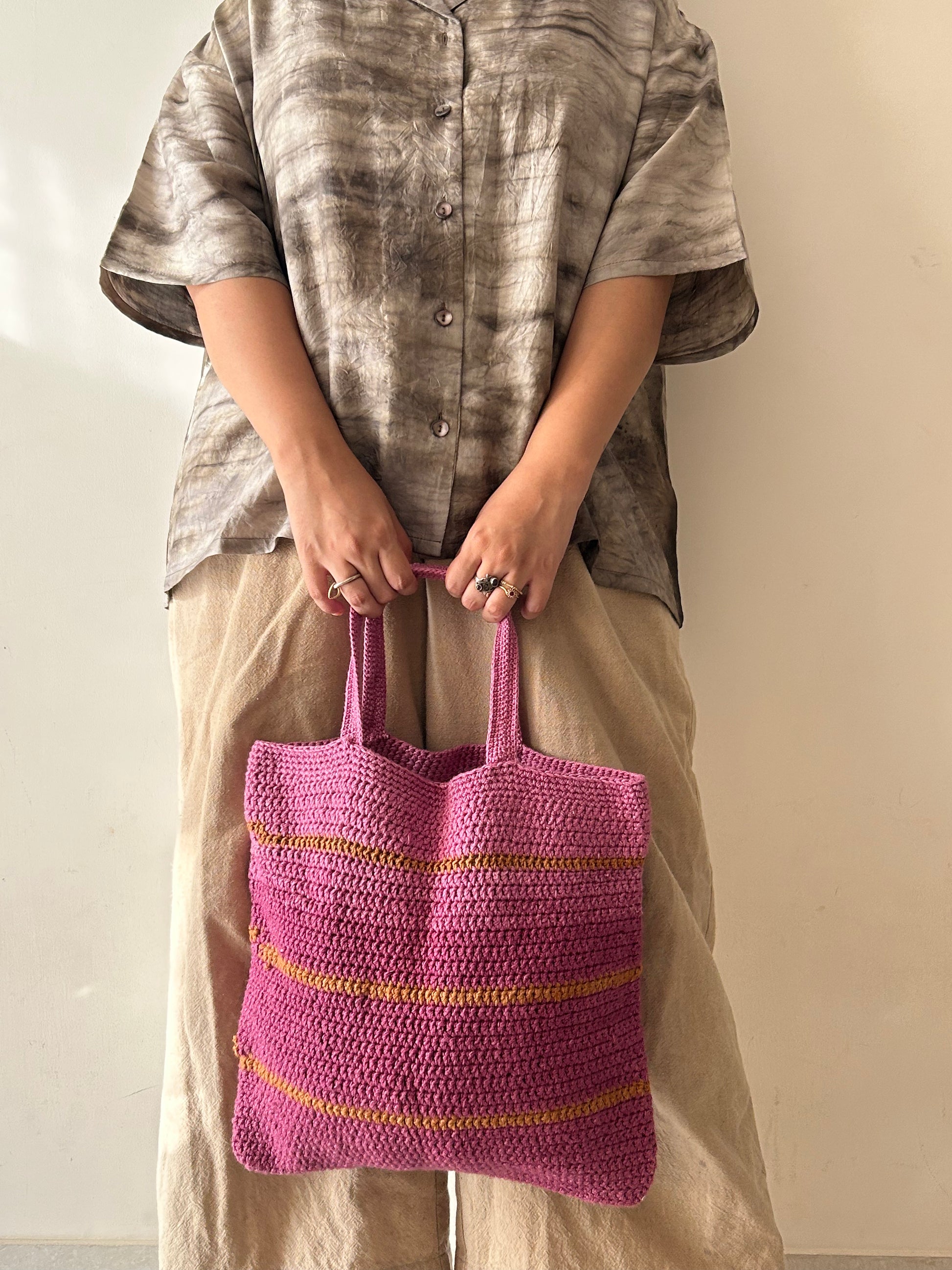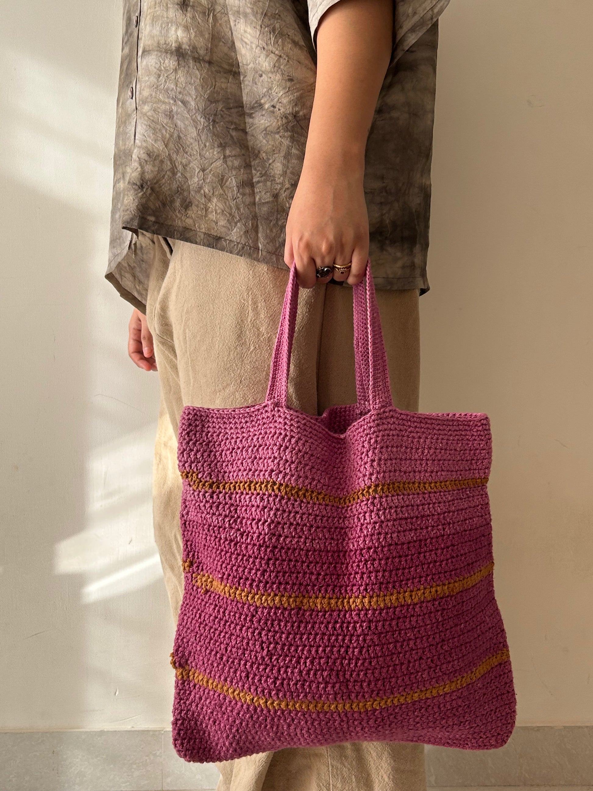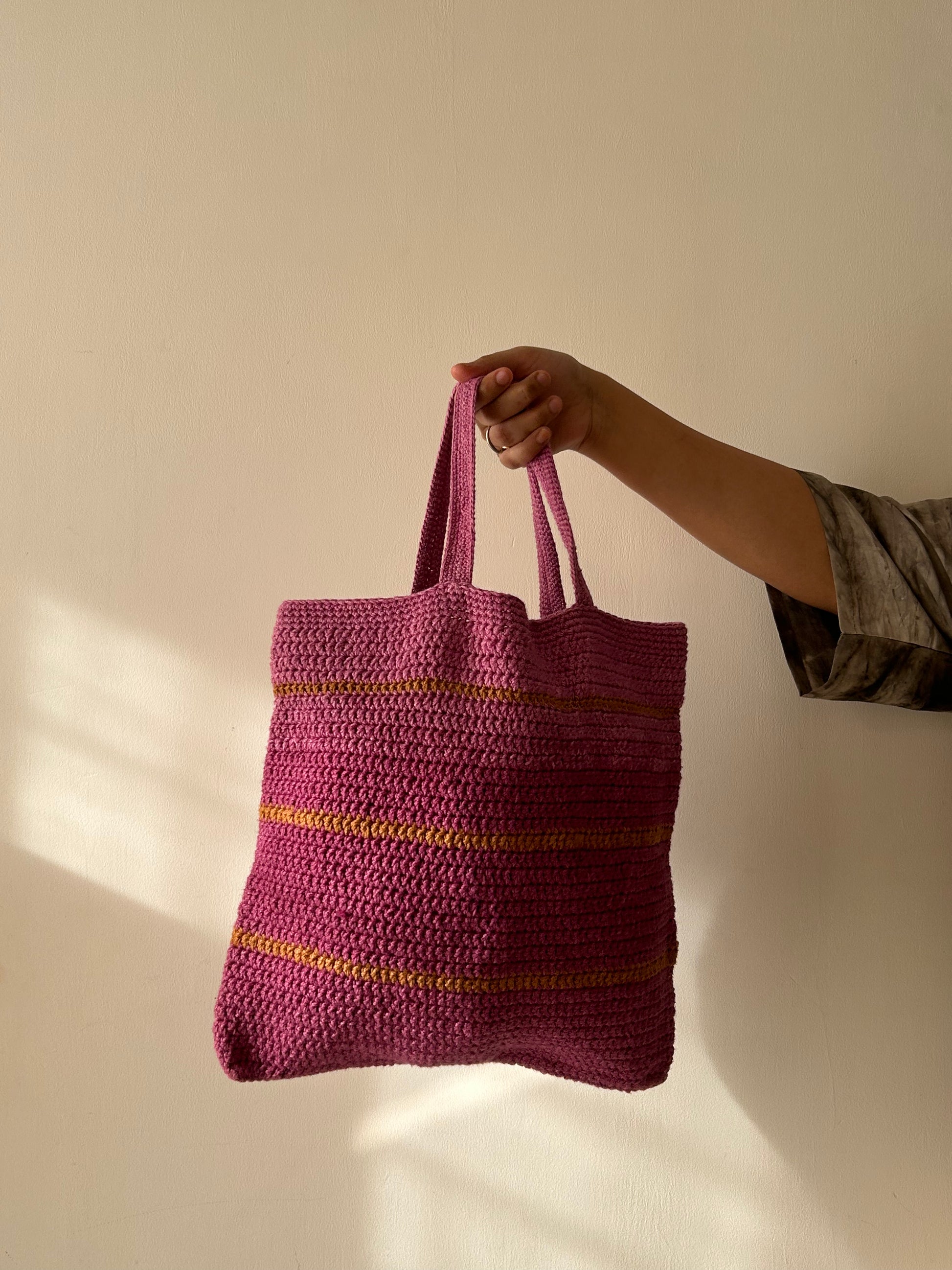 The bags are made using plant dyed cotton yarn in various colours. All the colours for each bag for also carefully picked by her.