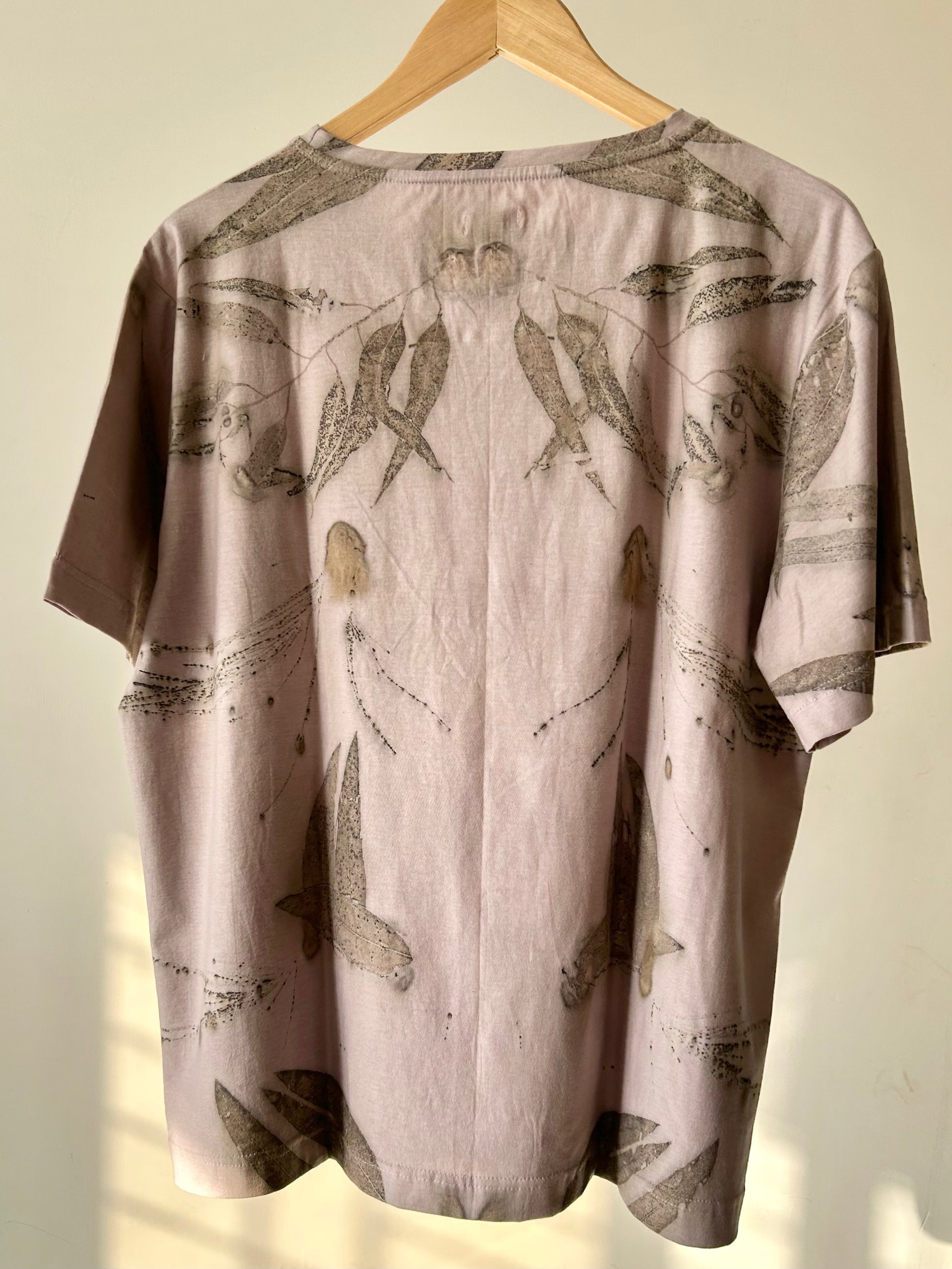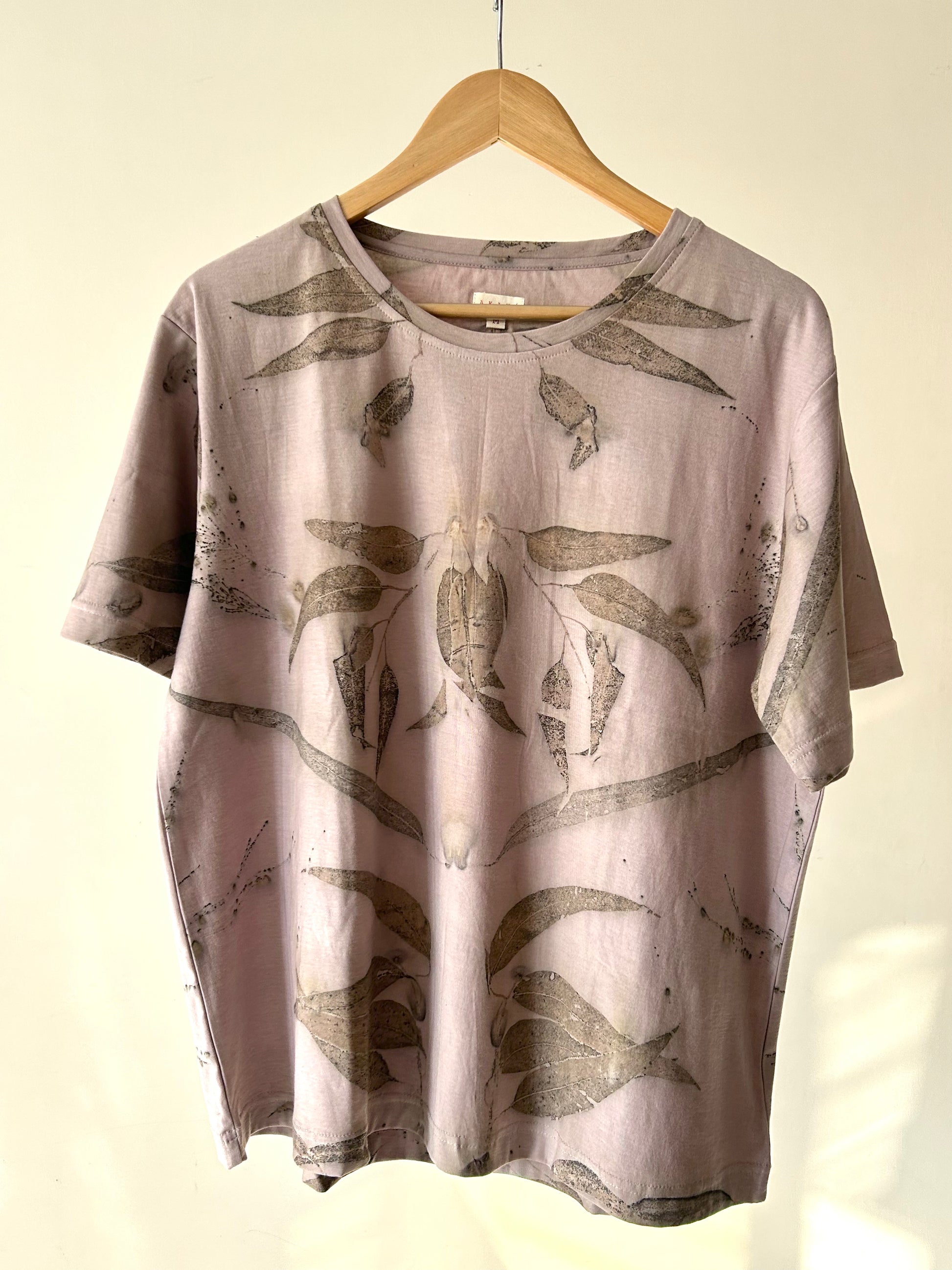 This Forest Tee is created using two different processes. First it is hand dyed using Sappan Wood followed by an ecoprint with Eucalyptus leaves.