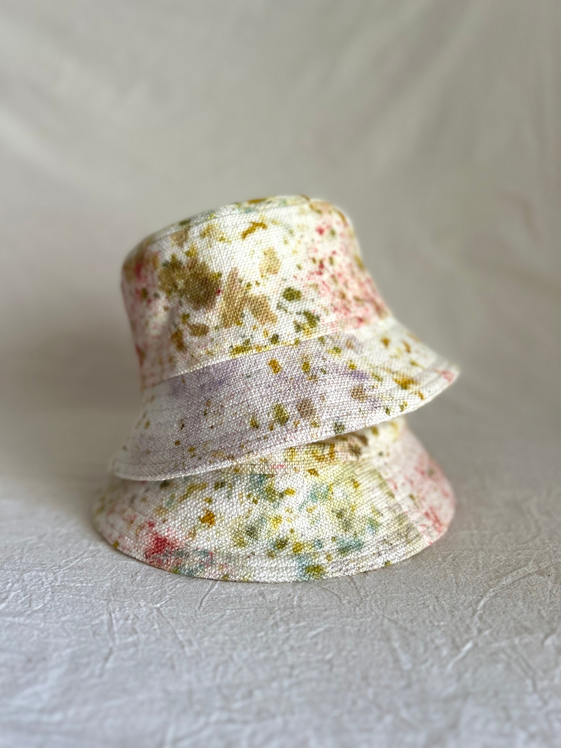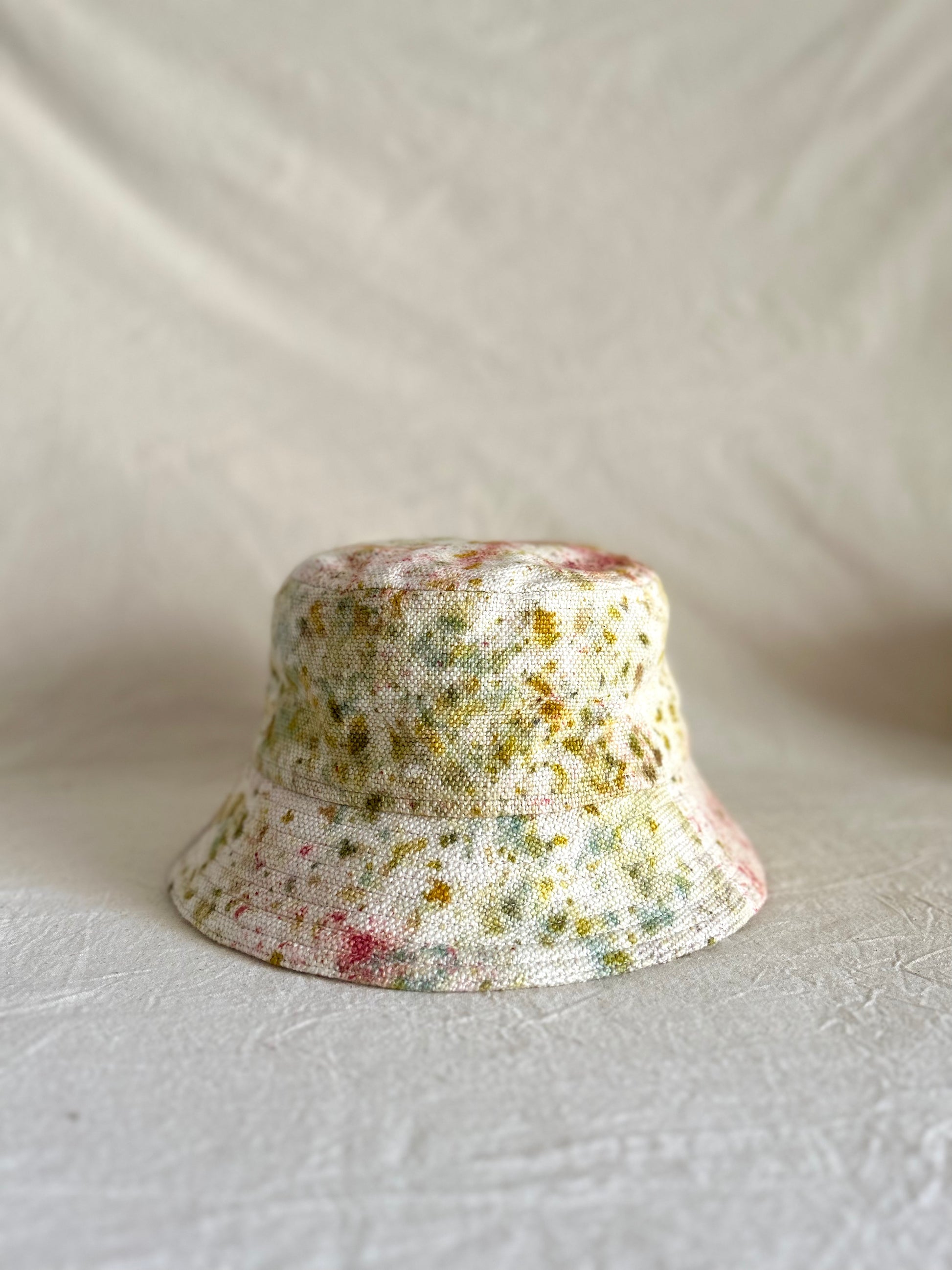A comfortable cotton canvas bucket hat dyed with locally foraged flowers. The handwoven cotton adds an interesting texture.