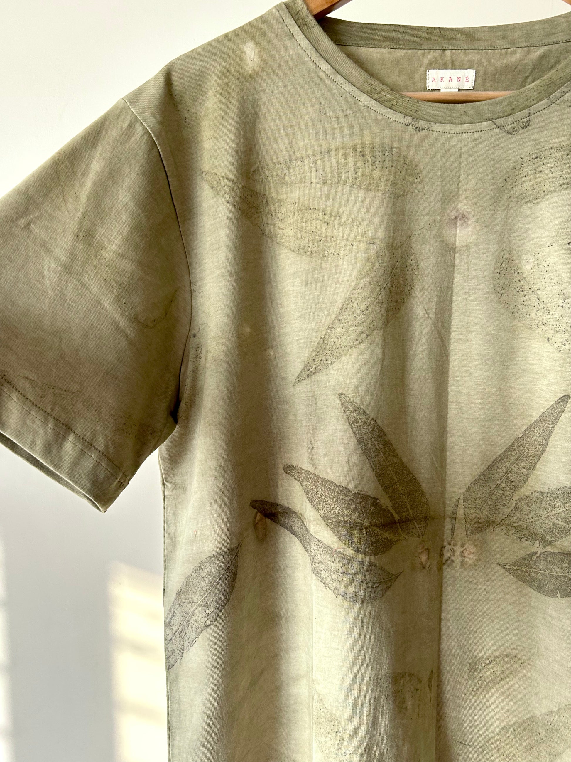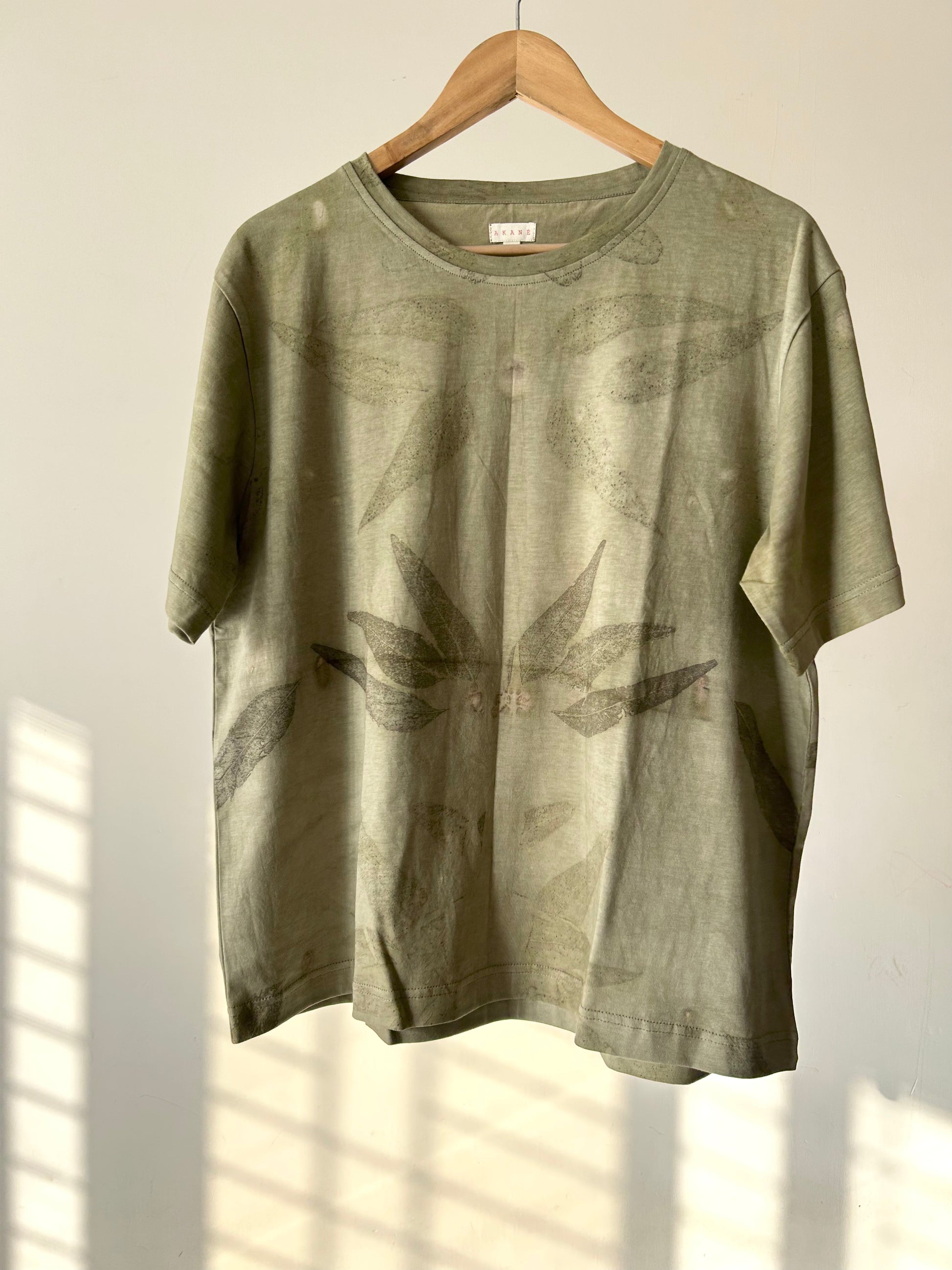 The fabric for each tee is dyed and ecoprinted individually and each leaf is placed meticulously to achieve a beautiful pattern.