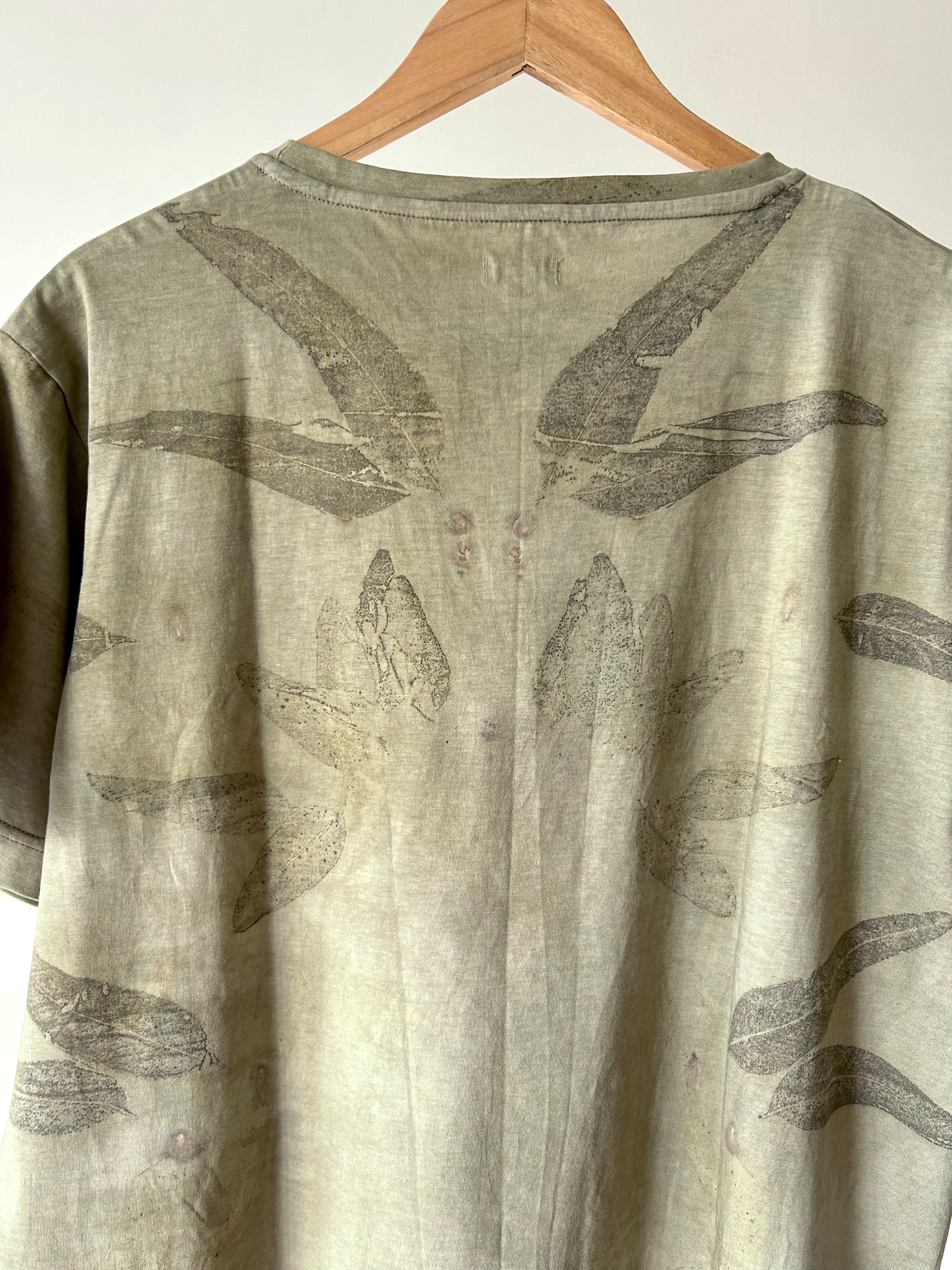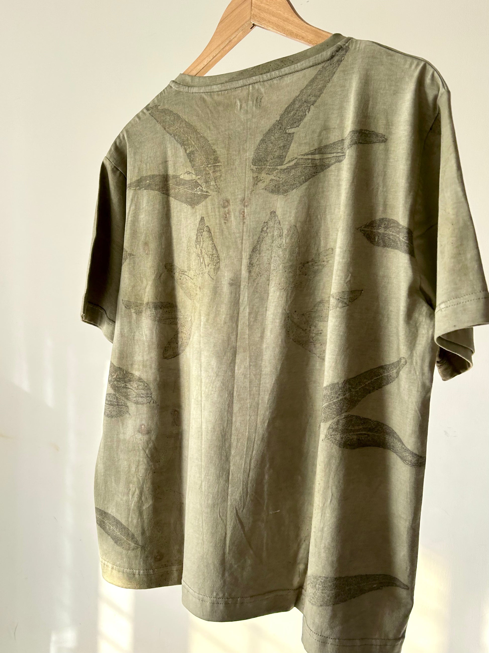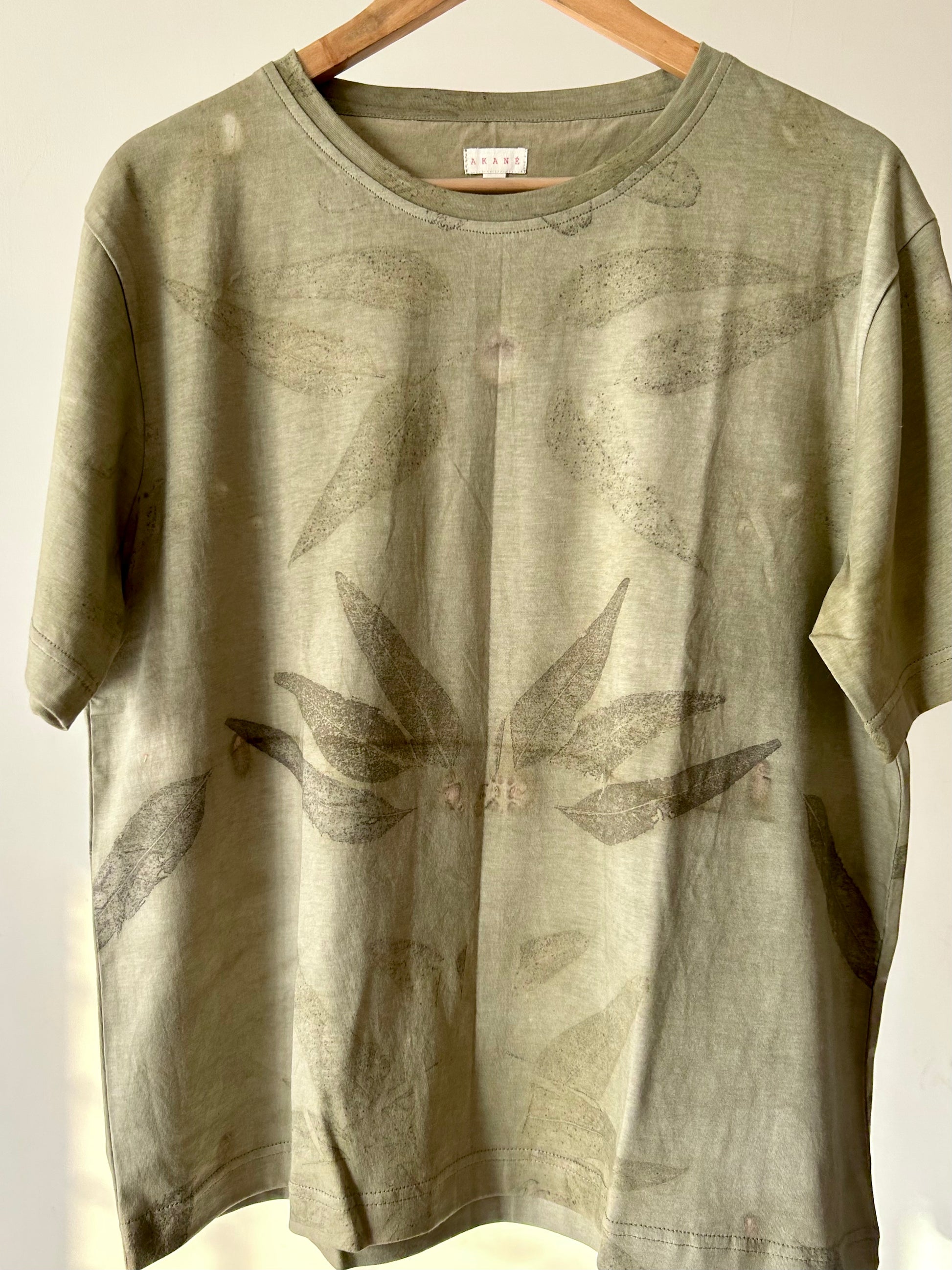 This Forest Tee is created using two different processes. First it is hand dyed using Marigold flowers followed by an ecoprint with Eucalyptus leaves.