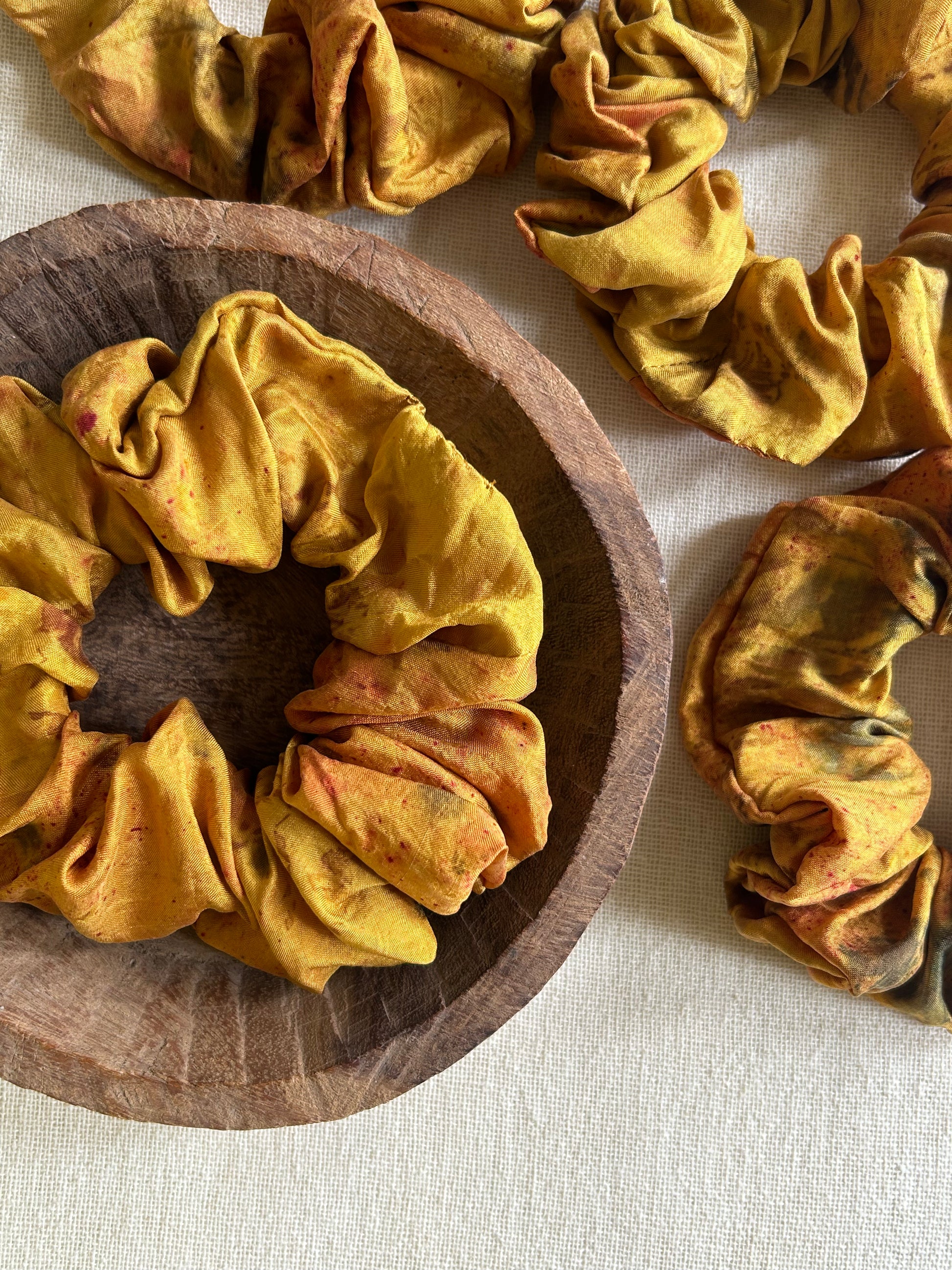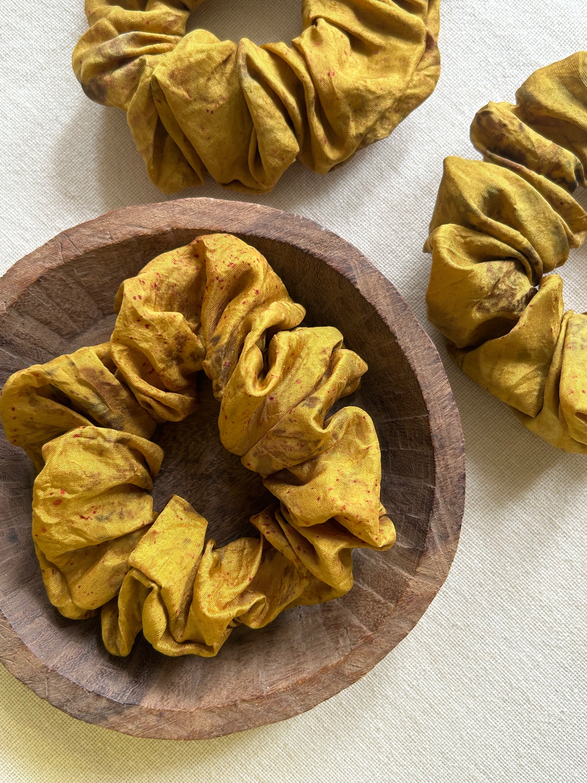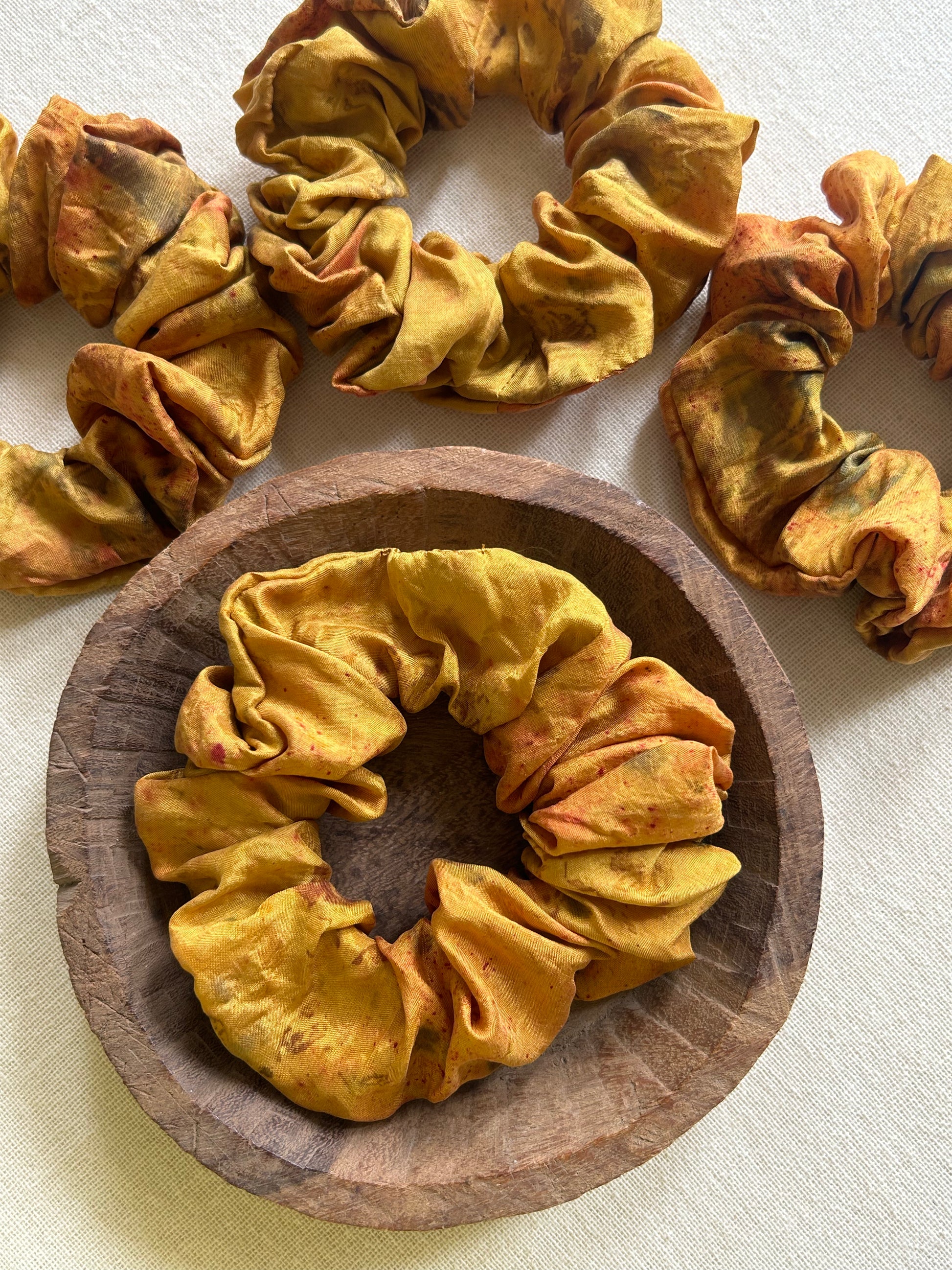 Silk scrunchies are kind to your hair and prevents breakage. Our silk scrunchies are plant dyed which kind to the environment as well.
