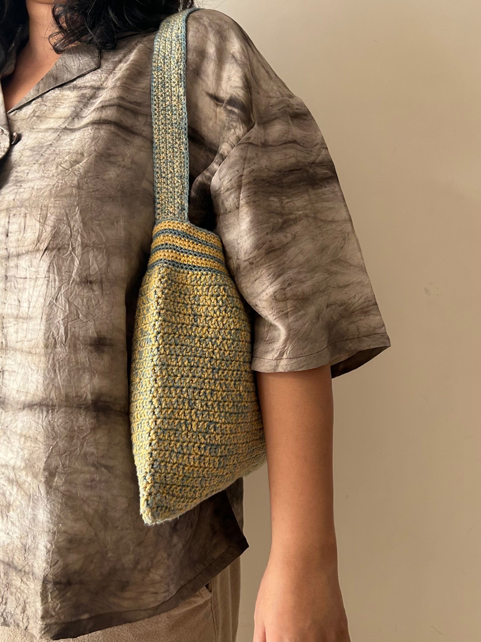 The bags are made using plant dyed cotton yarn in various colours. All the colours for each bag for also carefully picked by her.