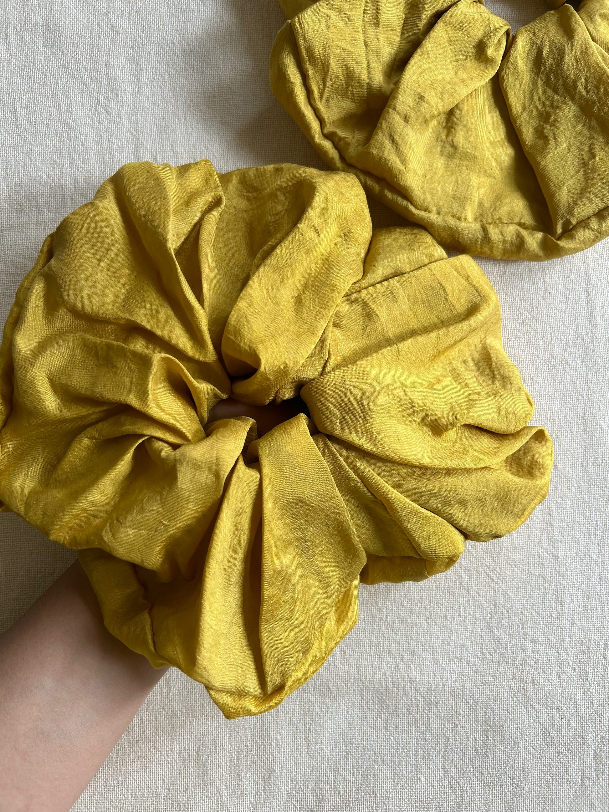 Just like our regular scrunchies, these are plant-dyed, making them gentle on the environment as well. Crafted from fabric cut-offs and trims, they are made with sustainability in mind, reducing waste and creating something beautiful from what might otherwise be discarded. Due to this process, quantities are limited, making each piece unique.