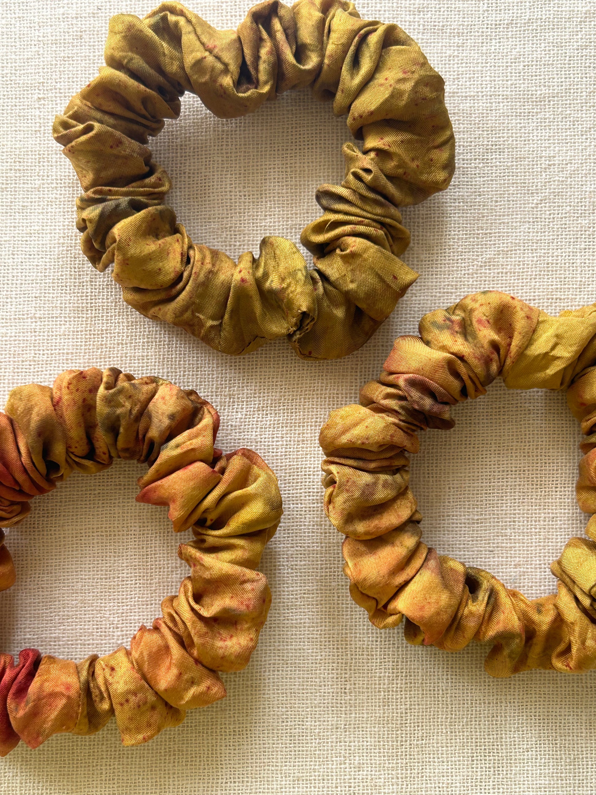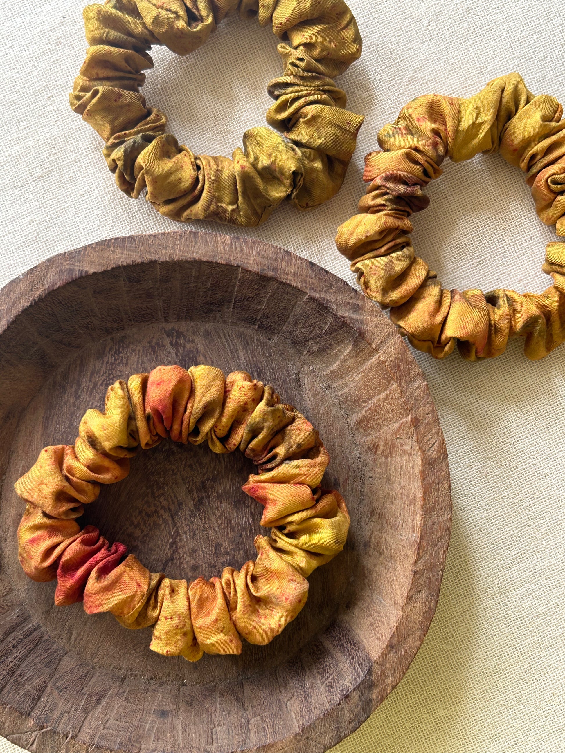 Silk scrunchies are kind to your hair and prevents breakage. Our silk scrunchies are plant dyed which kind to the environment as well.